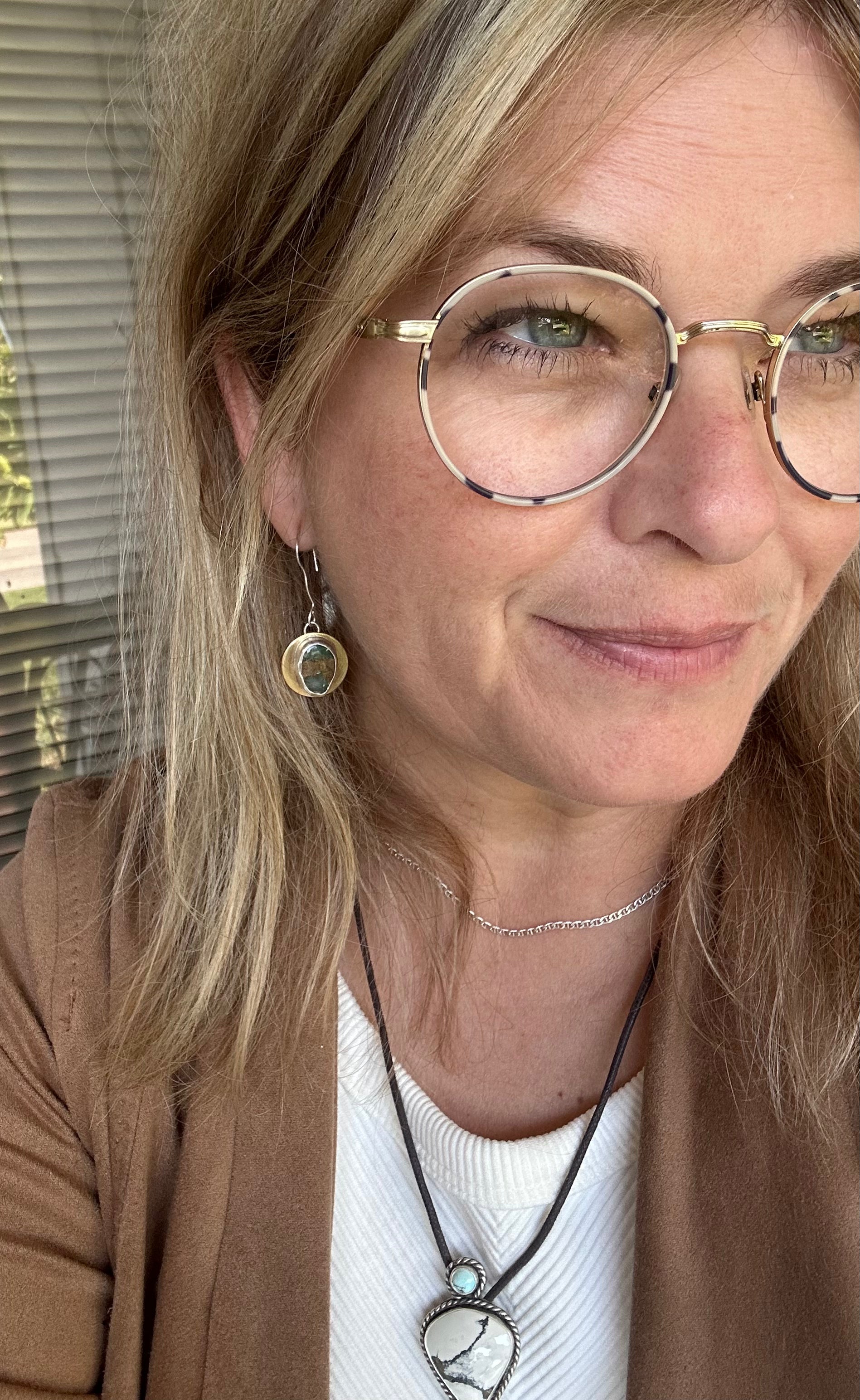 Beautiful, almost Translucent Gem Silica with Copper Matrix wrapped in Fine Silver and set on Bronze. Cute, funky and fun!