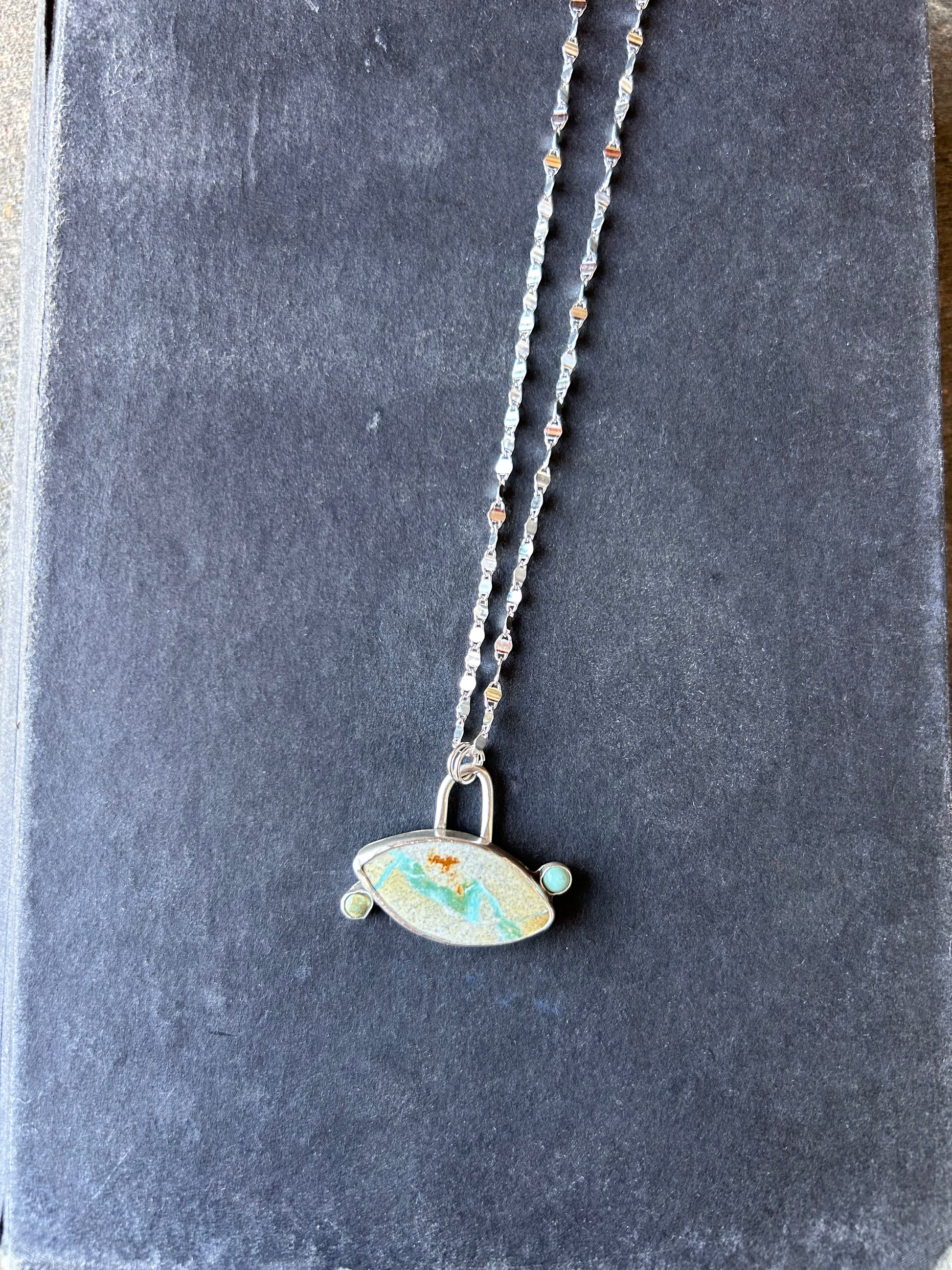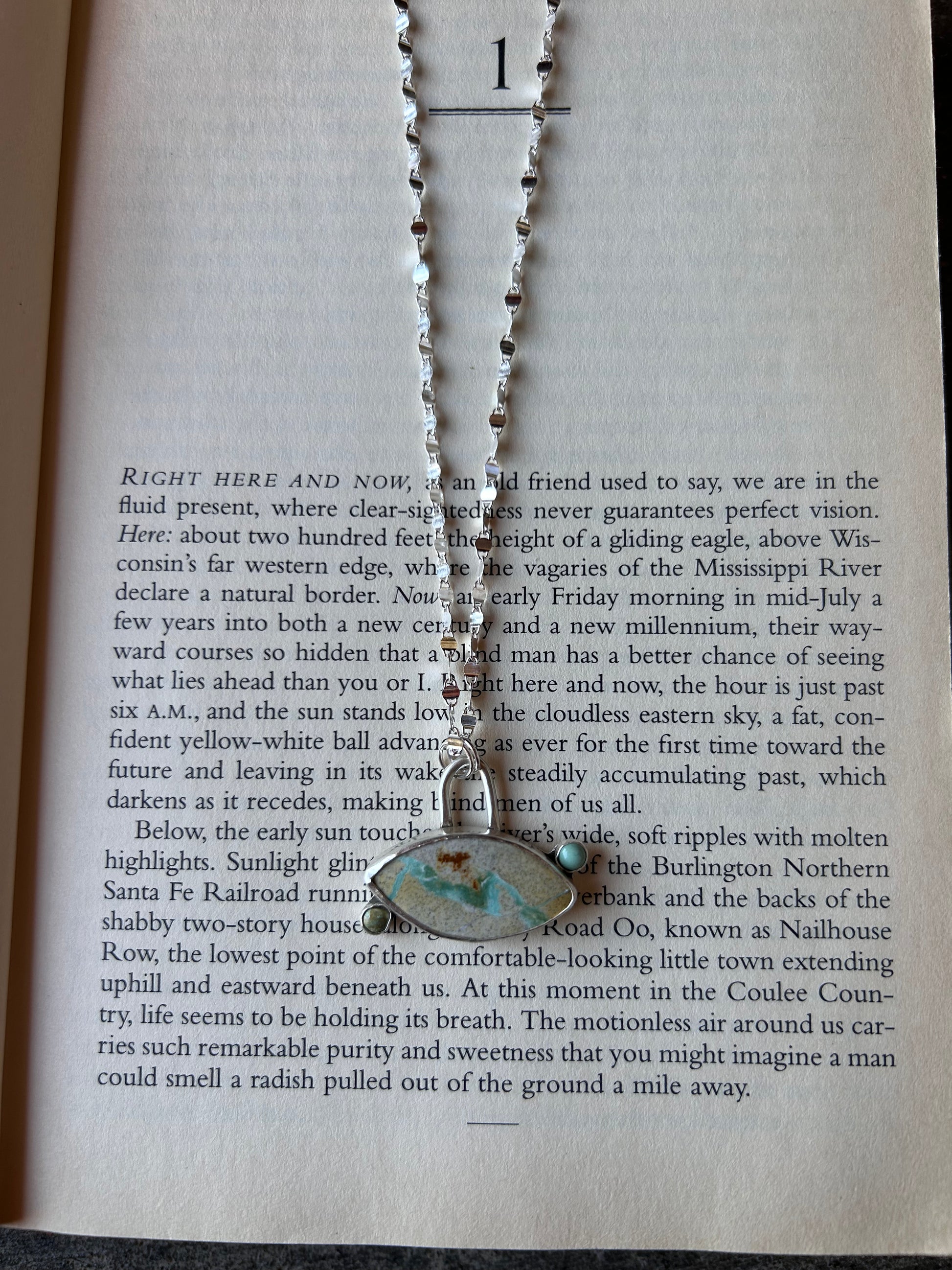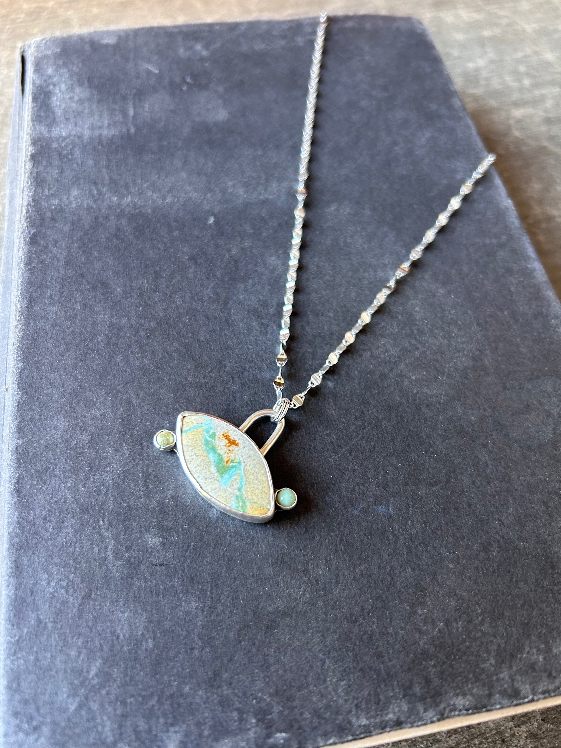 My first piece created with this amazing stone. Much like Royston Ribbon, this gives me Little River vibes. Accented with tiny Lone Mountain Turquoise.
