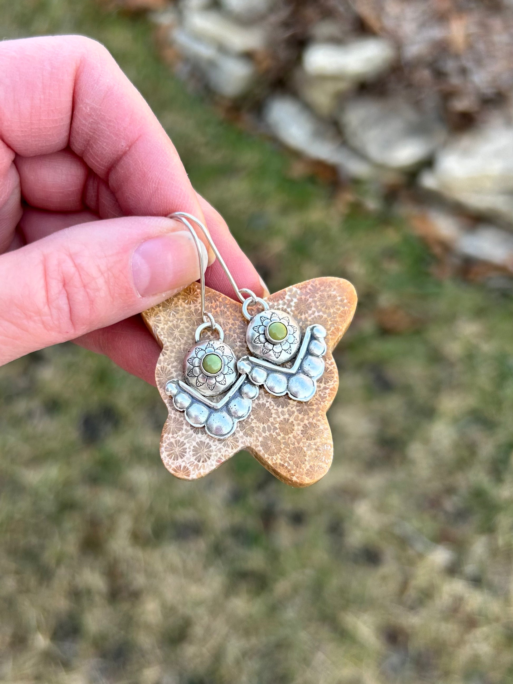 These super sweet little earrings were made using casted findings and stamped - domed Conchos with a tiny Lone Mountain Turquoise added for a special pop!