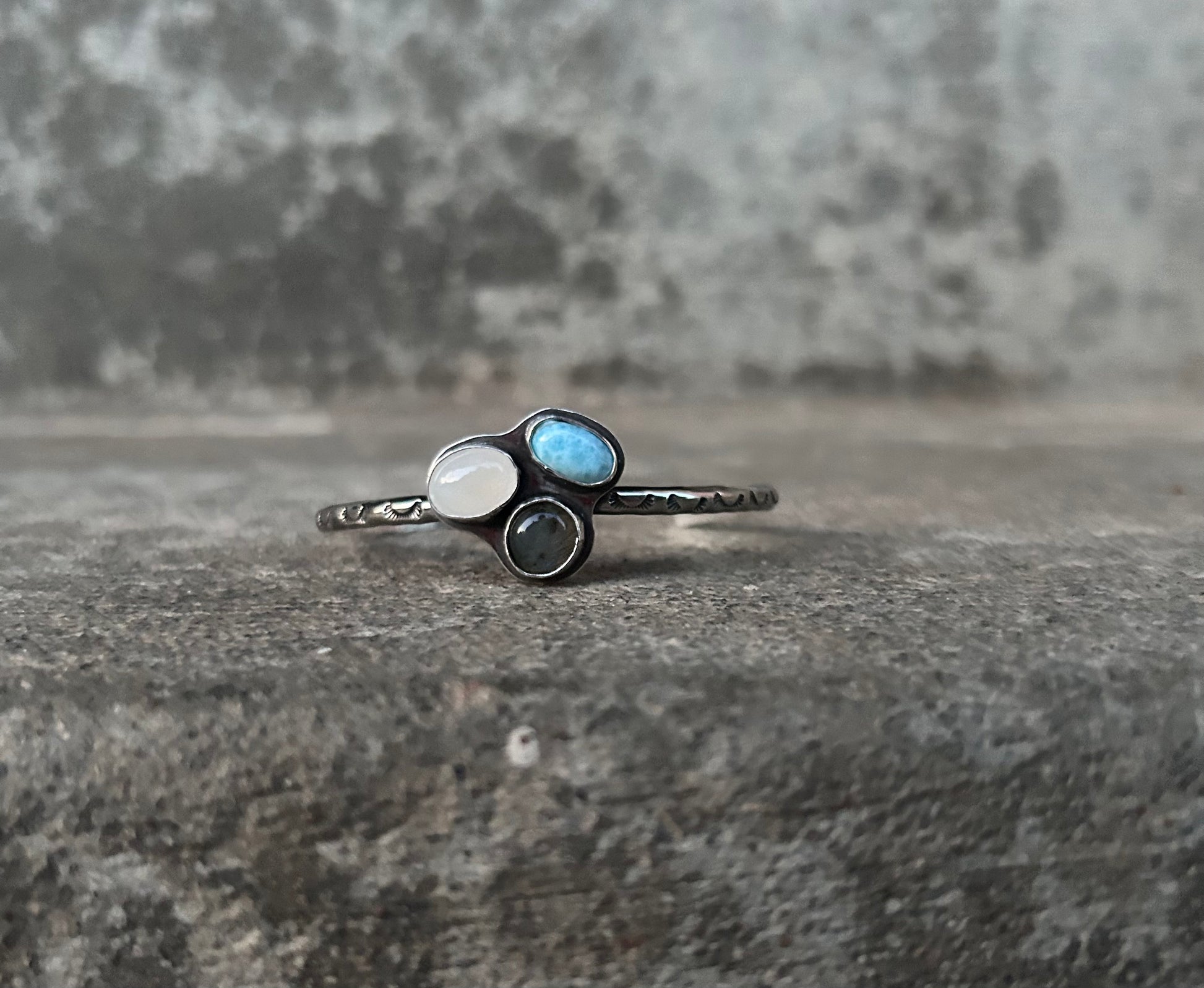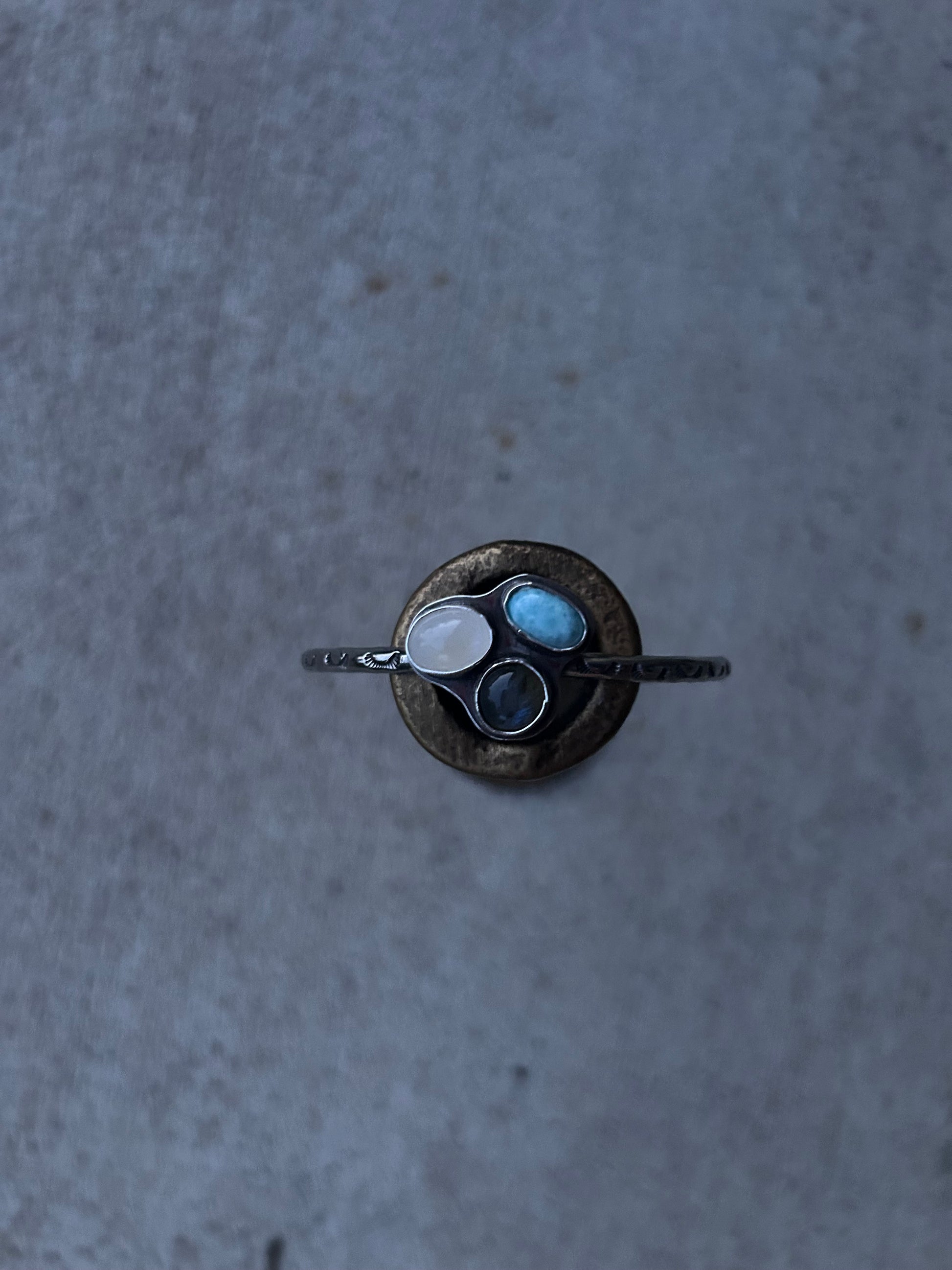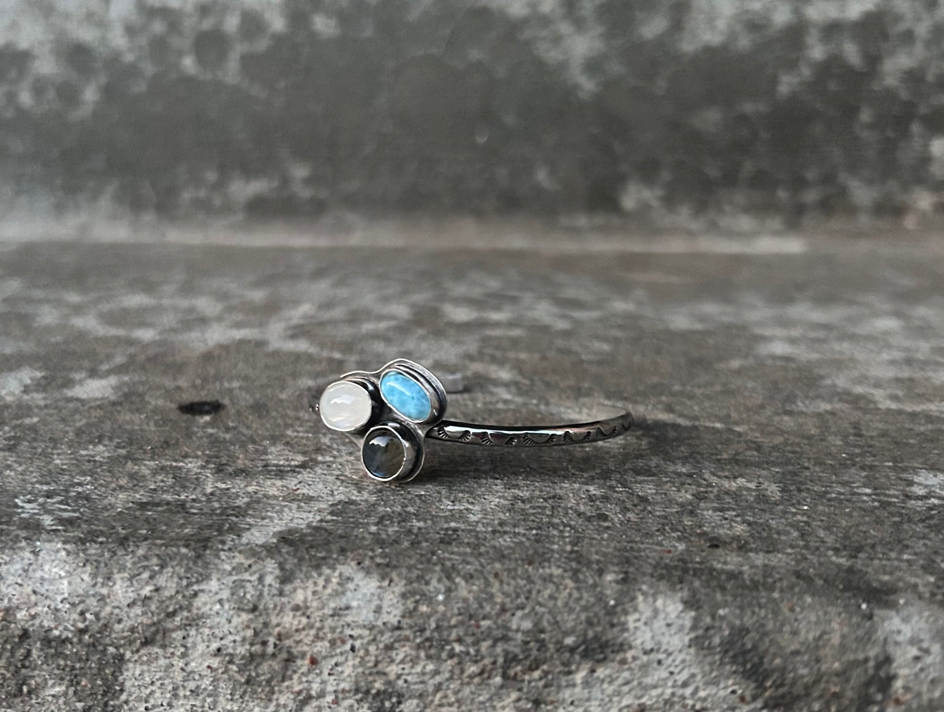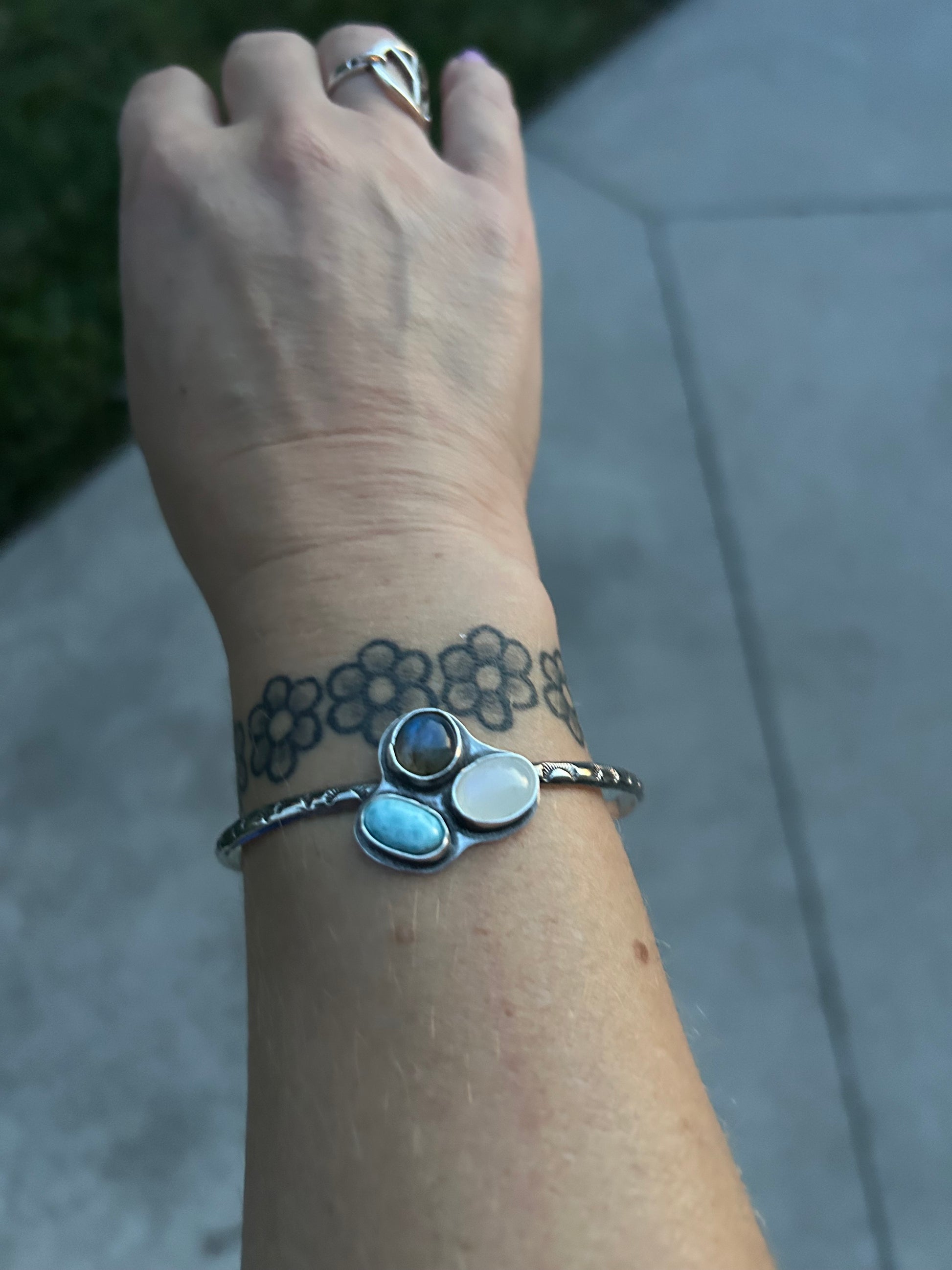 One of a kind Moonstone, Labradorite & Larimar cuff. Size large - will fit best on a 7”-8” wrist.