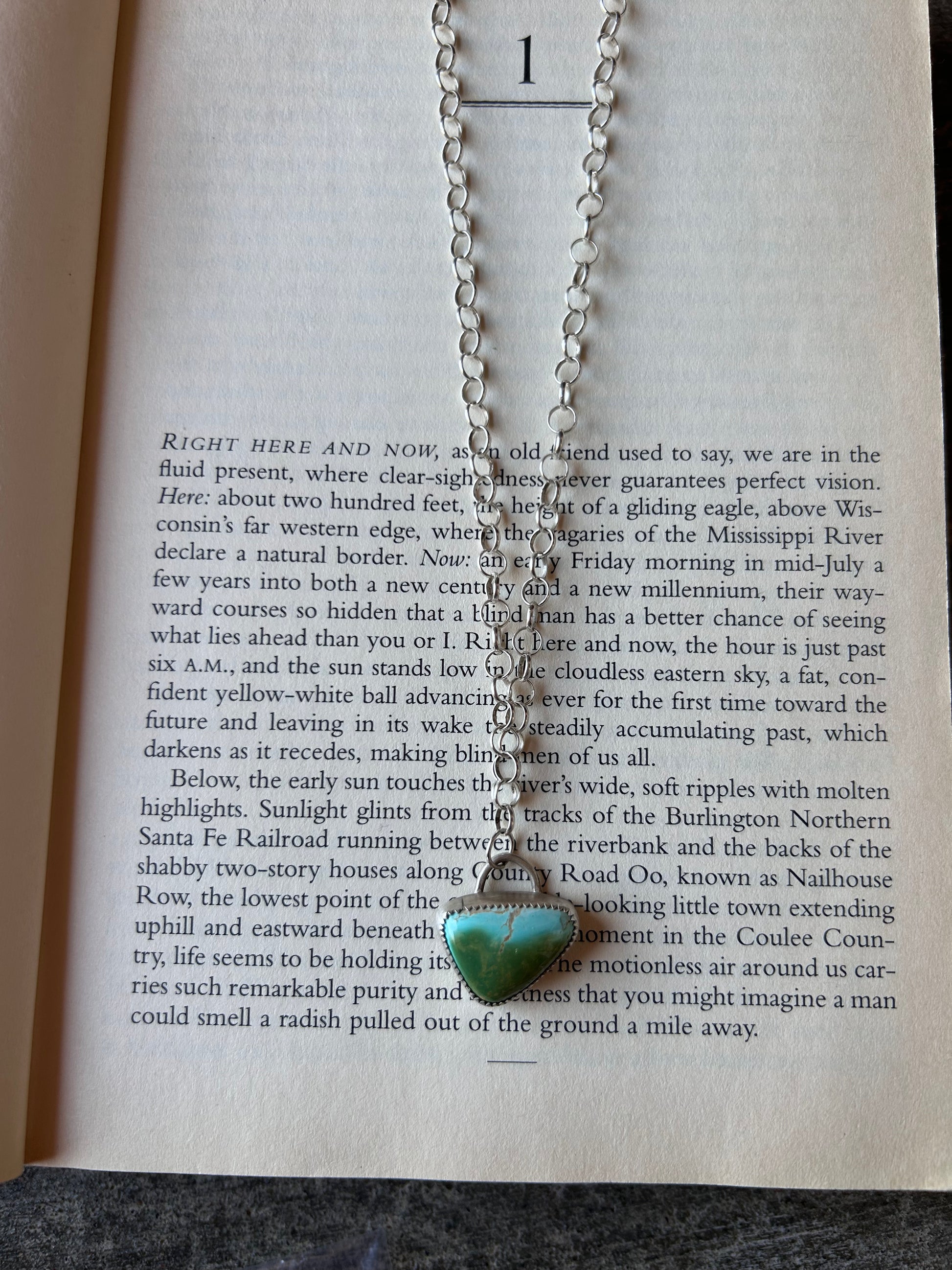 Gorgeous color combination in this Unique cut of Royston. I was lucky to score this rad little chunk of Turquoise. I chose a simple setting to let her shine! Hanging from 18” of Sterling Silver Rolo chain.