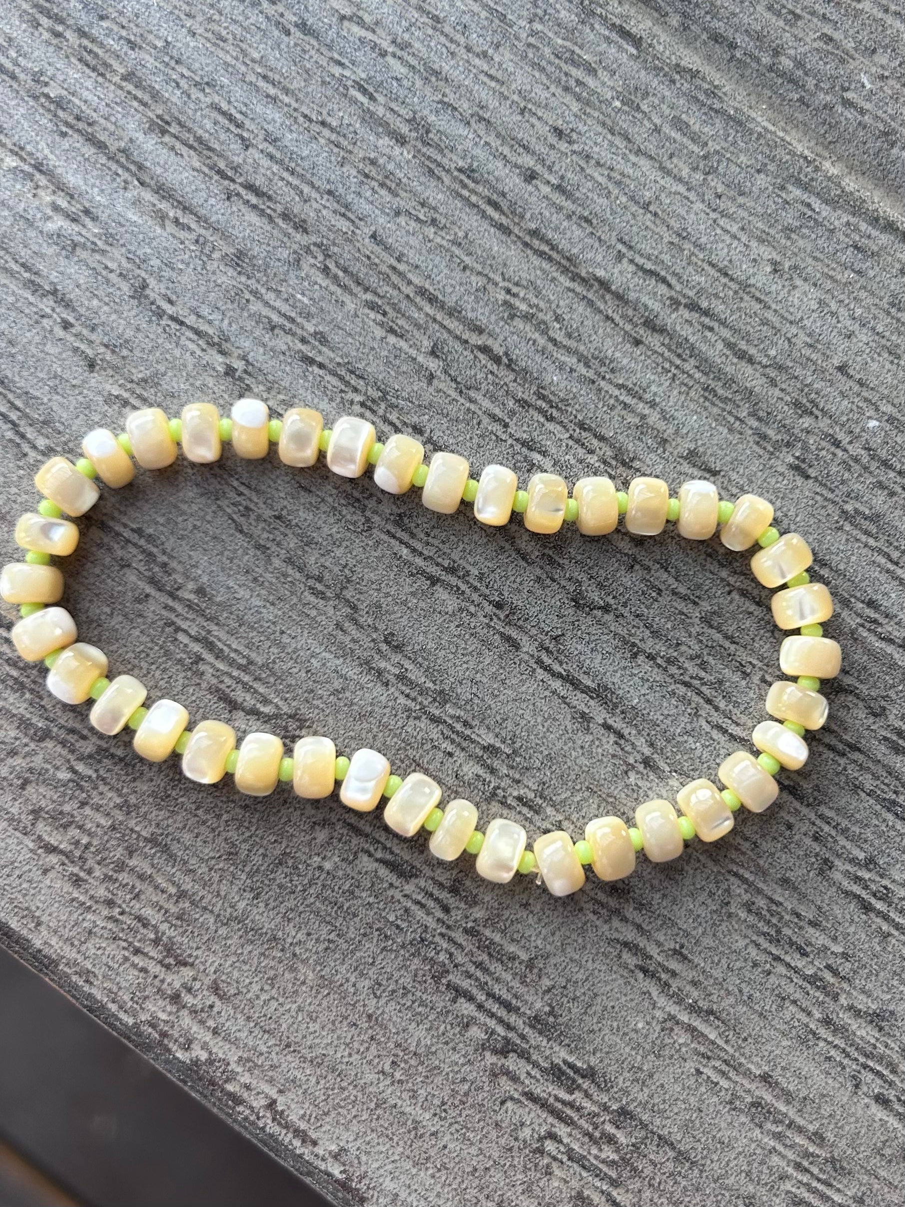 Gorgeous Mother of Pearl accented with lime green beads. These are stretchy bracelets and will fit up to 8” wrist. Were it alone or stack it up!