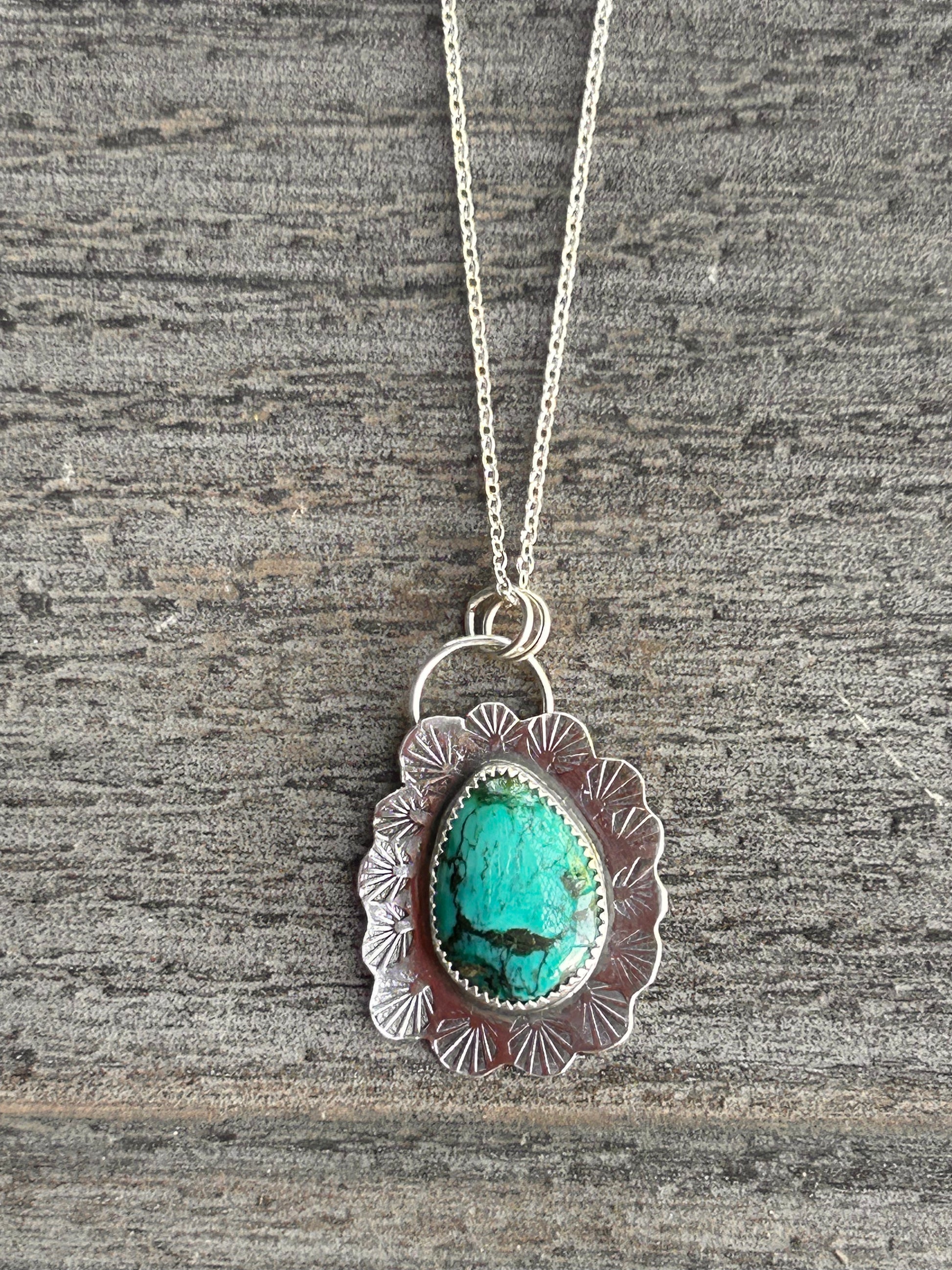 Lovely Turquoise Mountain set in Sterling Silver with a hand-stamped border detail. Hangs on a SS 17" chain.